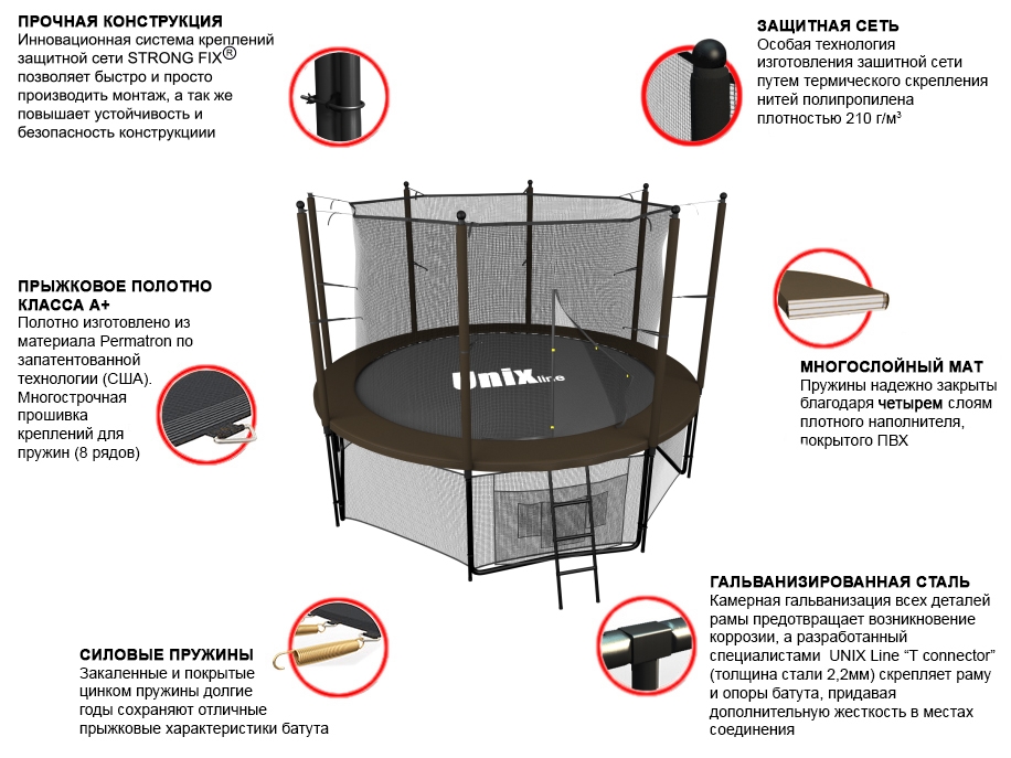 Металлический каркас батутов UNIX line™ выполнен из особо прочной гальванизированной стали с использованием новейшей системы креплений деталей рамы батута «T-Conneсtor» (толщина стали 2.2 мм), что обеспечивает высокую надежность рамы и уровень безопасности пользователя, максимально допустимый вес которого, в зависимости от модели (размера), может достигать 160 кг.