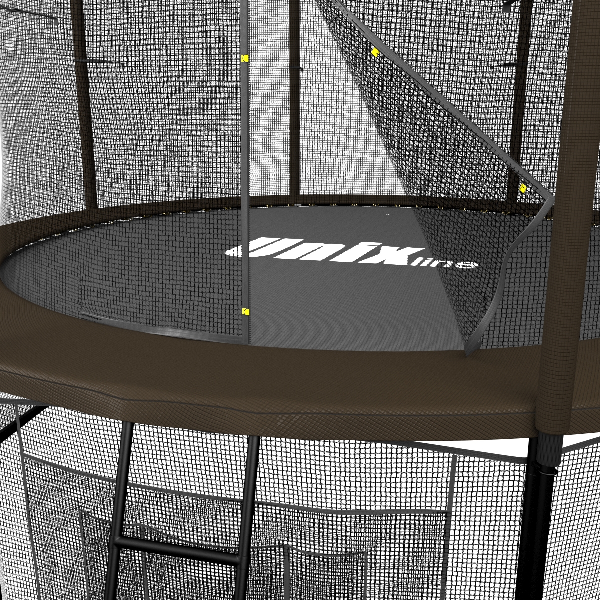 Помимо верхней защитной сетки, все батуты модельного ряда UNIX line™ оборудованы нижней защитной сеткой, которая препятствует проникновению под прыжковое полотно батута детей, животных, а также попаданию посторонних предметов, и лестницей для удобства пользования.