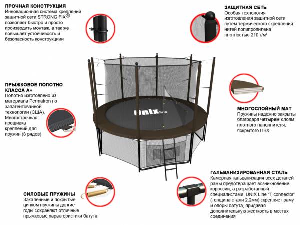 Батуты UNIX line™ серии Black&Brown разработаны для ежедневного использования детьми и взрослыми, устойчивы к неблагоприятным погодным условиям и соответствуют международным стандартам качества ISO 9001.