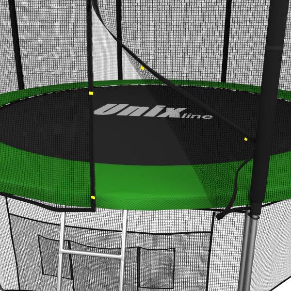 Помимо верхней защитной сетки, все батуты модельного ряда UNIX line оборудованы нижней защитной сеткой, которая препятствует проникновению под прыжковое полотно батута детей, животных, а так же попаданию посторонних предметов, и лестницей для удобства пользования. А в моделях диаметром от 10FT (305см.), в комплект входят специальные крепления батута к земле (колышки).