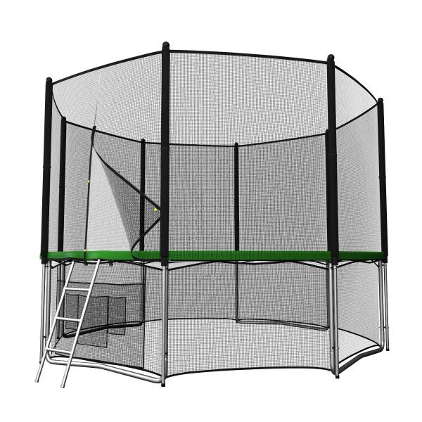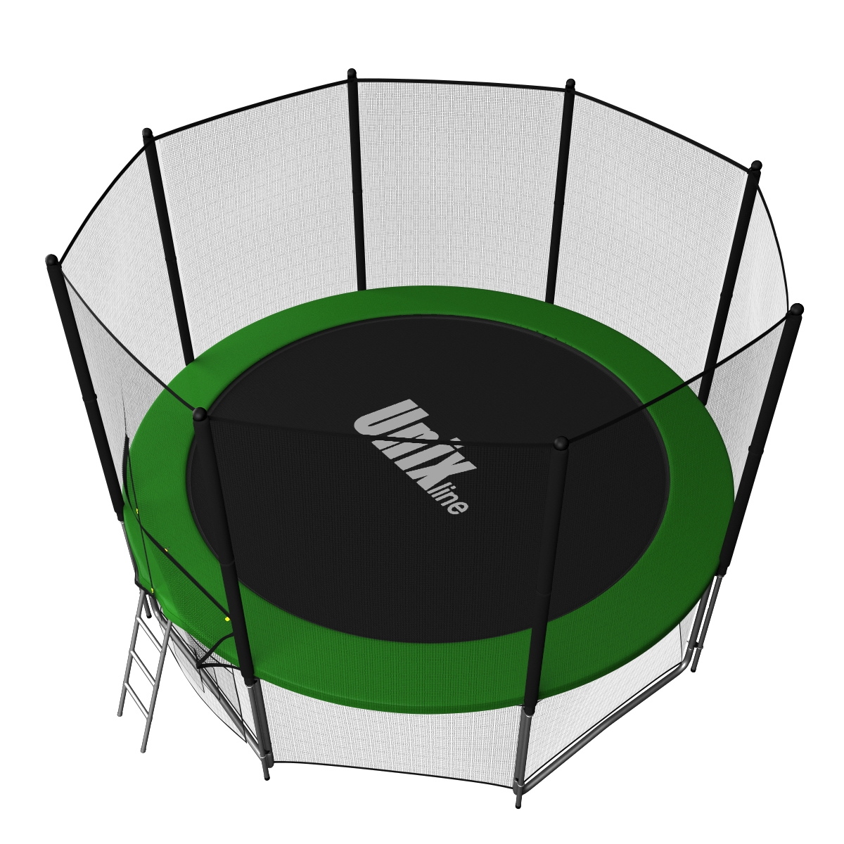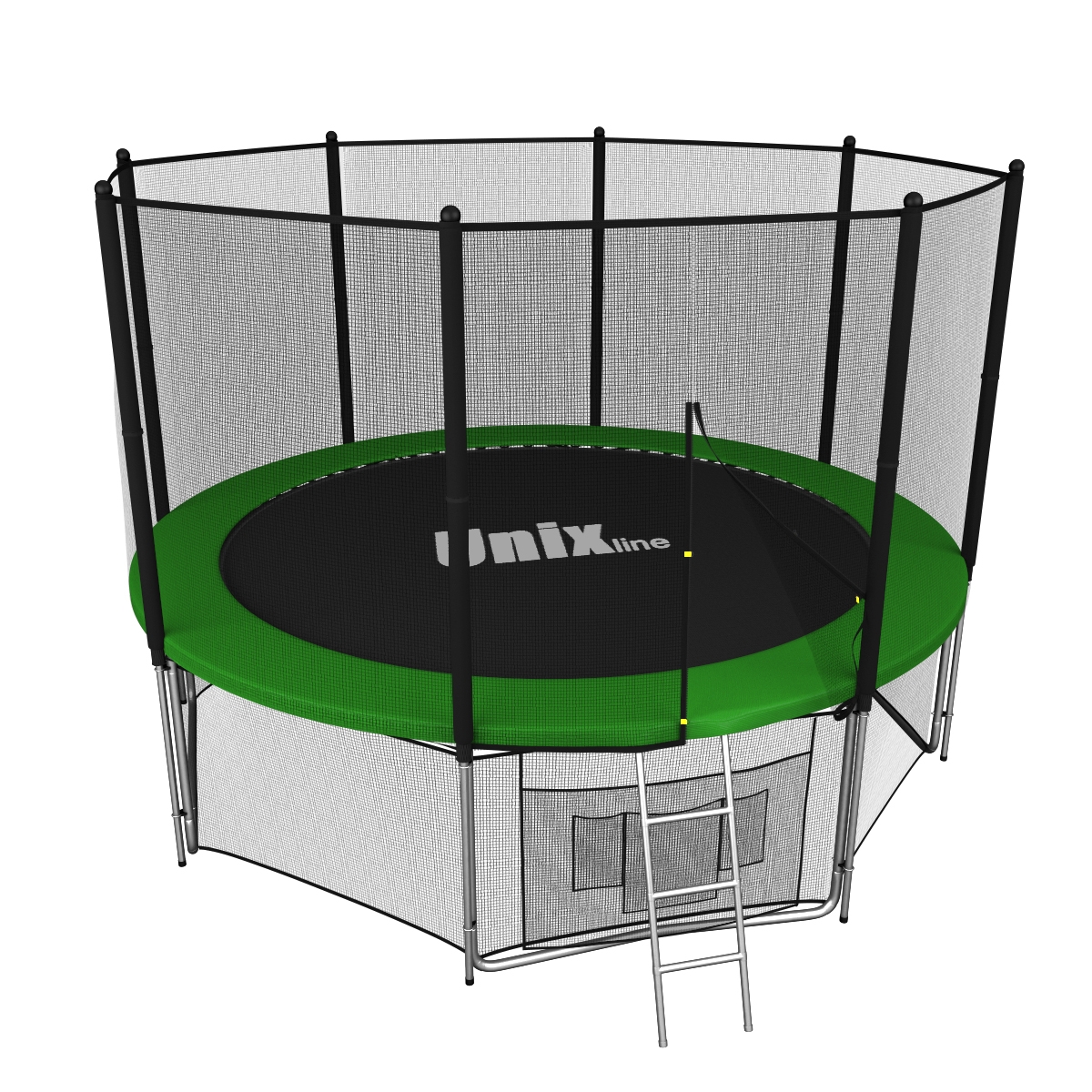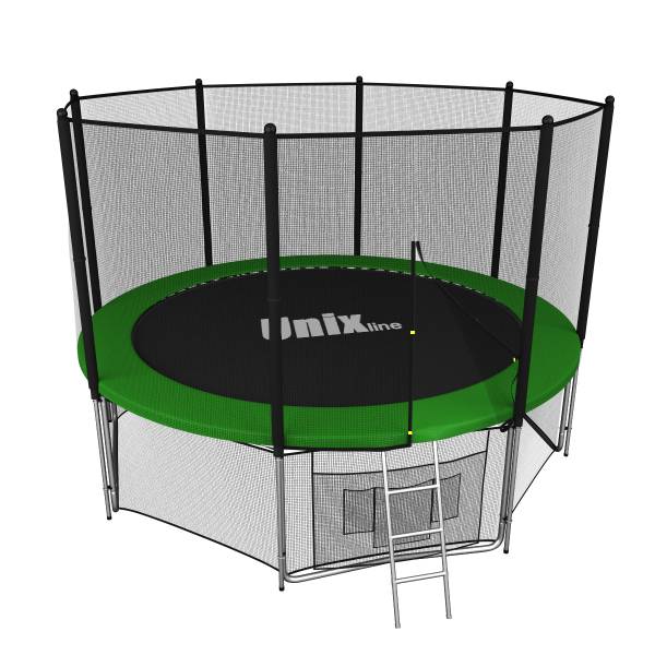 Помимо верхней защитной сетки, все батуты модельного ряда UNIX line оборудованы нижней защитной сеткой, которая препятствует проникновению под прыжковое полотно батута детей, животных, а так же попаданию посторонних предметов, и лестницей для удобства пользования. А в моделях диаметром от 10FT (305см.), в комплект входят специальные крепления батута к земле (колышки).