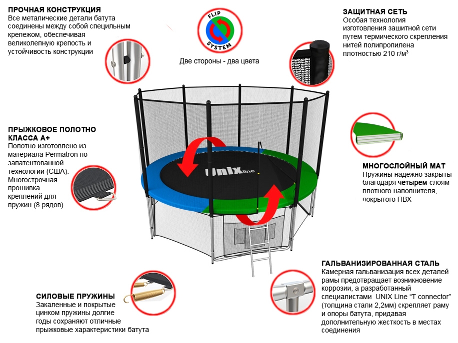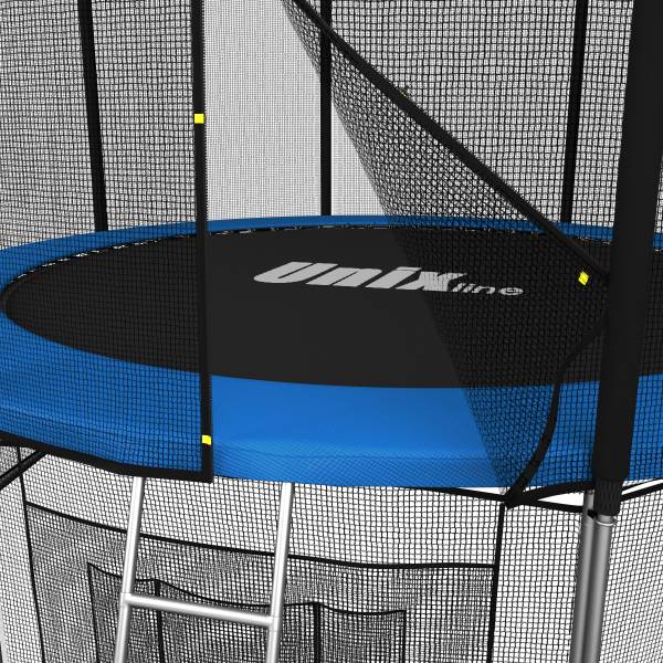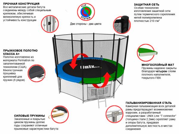 Помимо верхней защитной сетки, все батуты модельного ряда UNIX line оборудованы нижней защитной сеткой, которая препятствует проникновению под прыжковое полотно батута детей, животных, а так же попаданию посторонних предметов, и лестницей для удобства пользования. А в моделях диаметром от 10FT (305см.), в комплект входят специальные крепления батута к земле (колышки).