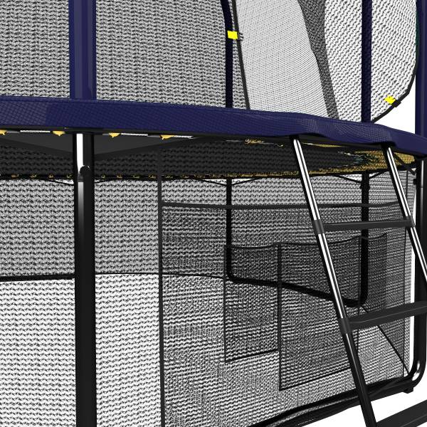 Помимо верхней защитной сетки, все батуты премиального модельного ряда UNIX line оборудованы нижней защитной сеткой, которая препятствует проникновению под прыжковое полотно батута детей, животных, а также попаданию посторонних предметов, и лестницей для удобства пользования. Так же в комплект входят специальные крепления батута к земле (колышки).