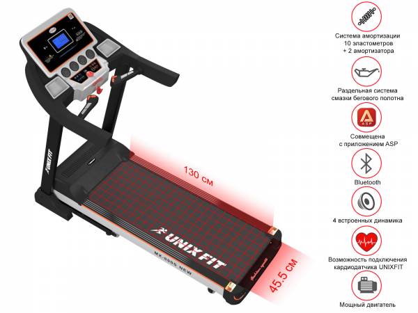 Беговые дорожки торговой марки UNIXFIT™ серии MX разработаны для ежедневных интенсивных тренировок спортсменов любого уровня подготовки. Все модели имеют автоматическую регулировку угла наклона беговой поверхности и улучшенную систему амортизации для обеспечения дополнительного комфорта во время их использования.