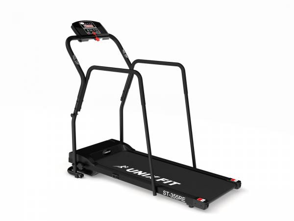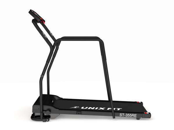 Беговая дорожка UNIXFIT™ ST-355RE разработана для реабилитационного использования и восстановления функций опорно-двигательного аппарата. Удлиненные поручни обеспечивают необходимый комфорт тренировки. Данная модель подходит также пожилым людям и пользователям, желающим сделать тренировки ещё более безопасными. UNIXFIT™ ST-355RE отличается легкостью и компактностью. К отличительным особенностям следует отнести комфортную для ходьбы и бега ширину бегового полотна, прочную раму и встроенные в поручни датчики измерения пульса. Максимальная скорость 10 км/ч соответствует бегу в среднем и быстром темпе, что позволяет проводить полноценные тренировки пользователям с высоким уровнем физической подготовки.