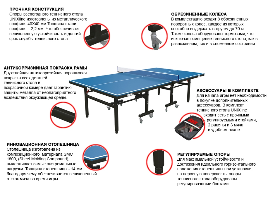 Столешница всепогодных столов UNIX line изготовлена из композиционного материала SMC 1800, (Sheet Molding Compound), который выдерживает самые экстремальные температурные нагрузки, не является горючим материалом, устойчив к осадкам, а также, за счет высокой плотности и толщины столешницы 14 мм.(!), обеспечивается великолепный отскок мяча во время игры.