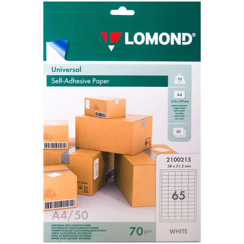 Бумага самоклеящаяся, 65 фрагментов, матовая. Размер фрагмента 38 × 21,2 мм. Формат А4. 50 листов в упаковке. Плотность 70 г/м². Цвет бумаги - белый.091435 Бумага самоклеящаяся А4 50л. LOMOND 65 фр.(38*21,2) 2100215 [РЦ]