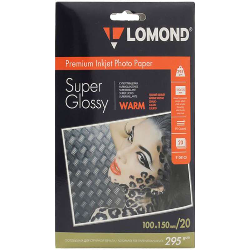 Супергланцевая тепло-белая фотобумага для струйной печати. Отпечатки отличаются высоким глянцем.Бумага A6 (100*150) для стр. принтеров Lomond, 295г/м2 (20л) супергл.