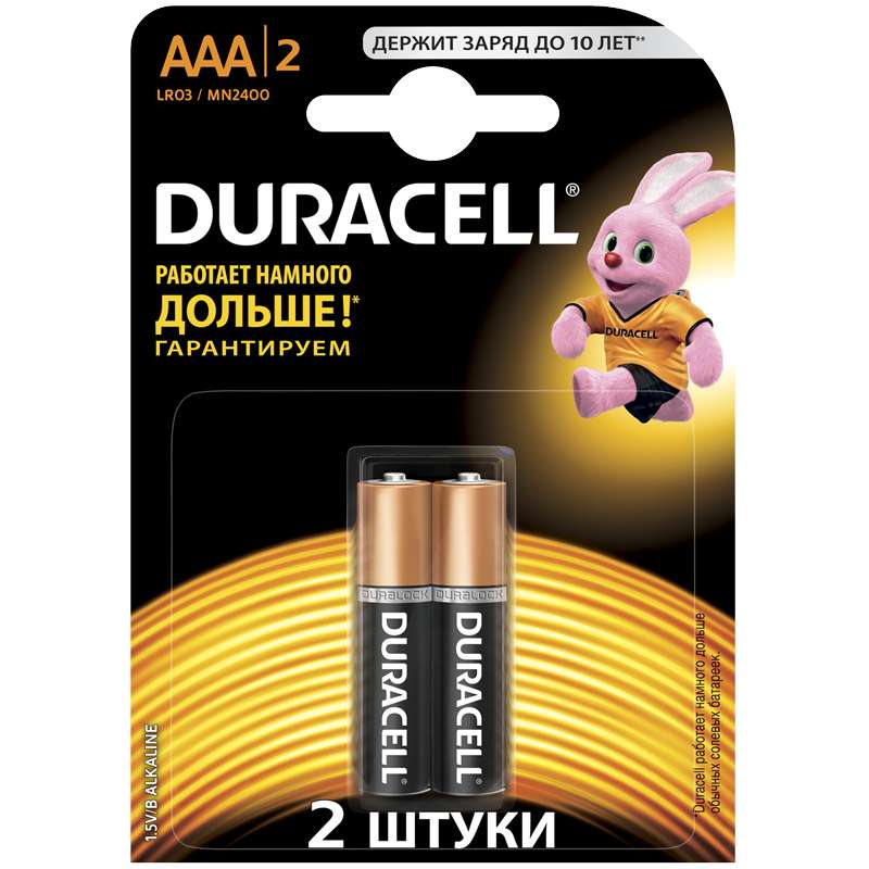 Батарейки для продуктов с низким и средним потреблением энергии. Продукт Duracell® – один из лучших на рынке щелочных элементов питания по продолжительности использования и соотношению цены и качества. Работают до 10 раз дольше, чем обычные солевые батарейки. Надежный источник энергии на каждый день. Работает дольше, намного дольше!* *по сравнению с обычными солевыми батарейками . Цена указана за одну батарейкуБатарейка Duracell Basic AAA (LR03) 2BL