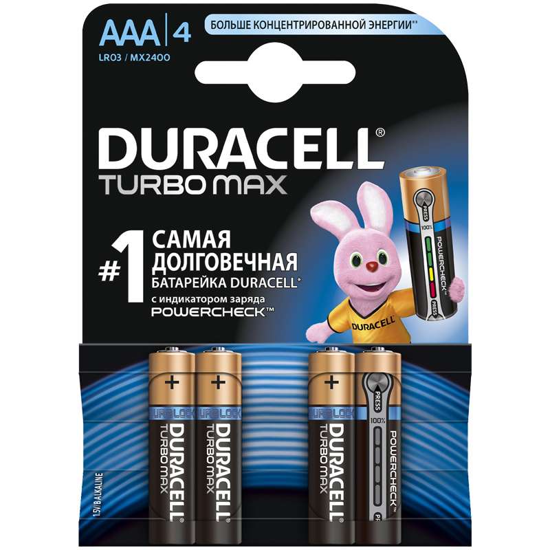 Главная / Товары / КАНЦТОВАРЫ / УПАКОВКА / ХОЗ ТОВАРЫ / РАСХОДНЫЕ МАТЕРИАЛЫ / Бытовая техника / Батарейки, аккумуляторы, зарядные устройства / Батарейки / Батарейка Duracell Turbo Max AAA (LR03) 4BL
