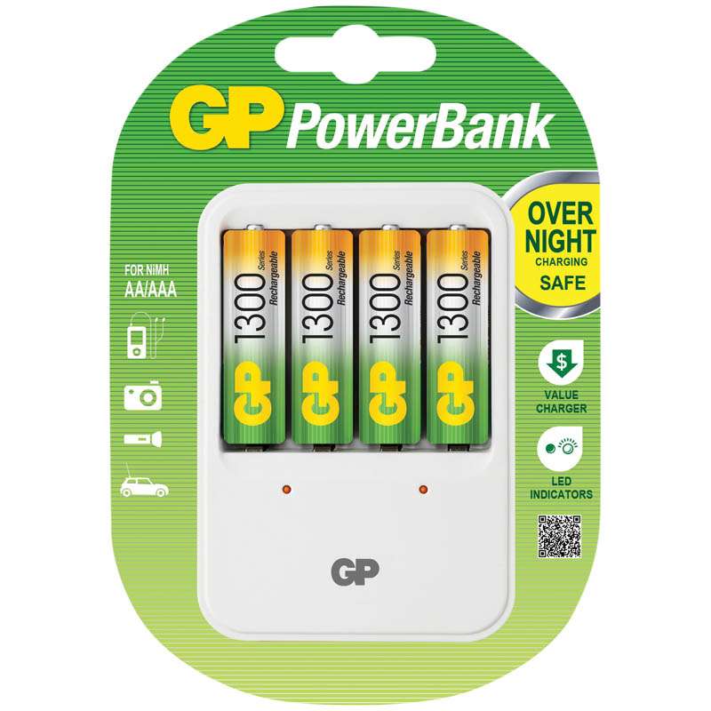 GP PowerBank серии STANDARD - экономия средств, безопасный заряд и удобство обращения. Если Вам нужно зарядить аккумуляторы типоразмеров ААА, АА просто поместите Ваши аккумуляторы в устройство и оставьте их заряжаться на всю ночь. Автоматический таймер гарантирует безопасный процесс заряда, после которого Вы можете вытащить заряженные аккумуляторы, когда они Вам понадобятся. Безопасный заряд в течение ночи. Индикатор статуса заряда аккумулятора. Два канала для заряда позволяют заряжать 2 или 4 никель-металлгидридных аккумулятора типоразмеров АА или АААЗарядное устройство GP PB420GS130-2CR4 + 4шт акк. HR06 1300mAh