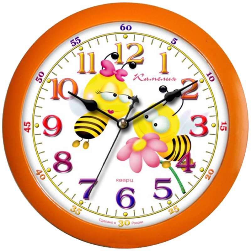 Часы настенные детские. Корпус-пластик + ободок с покрытием, стекло - 3 мм, круг -29см. Работают от 1 элемента питания типа АА (в комплект не входит).Часы настенные ход плавный, детские Камелия "Пчелки", круглые, 29*29*3,5, оранжевая рамка