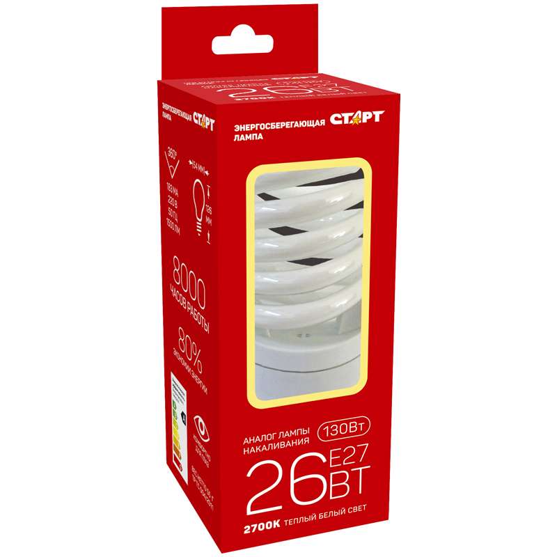 Лампа энергосберегающая Старт E 26W, SPC E27, 2700K 8Y, теплый свет