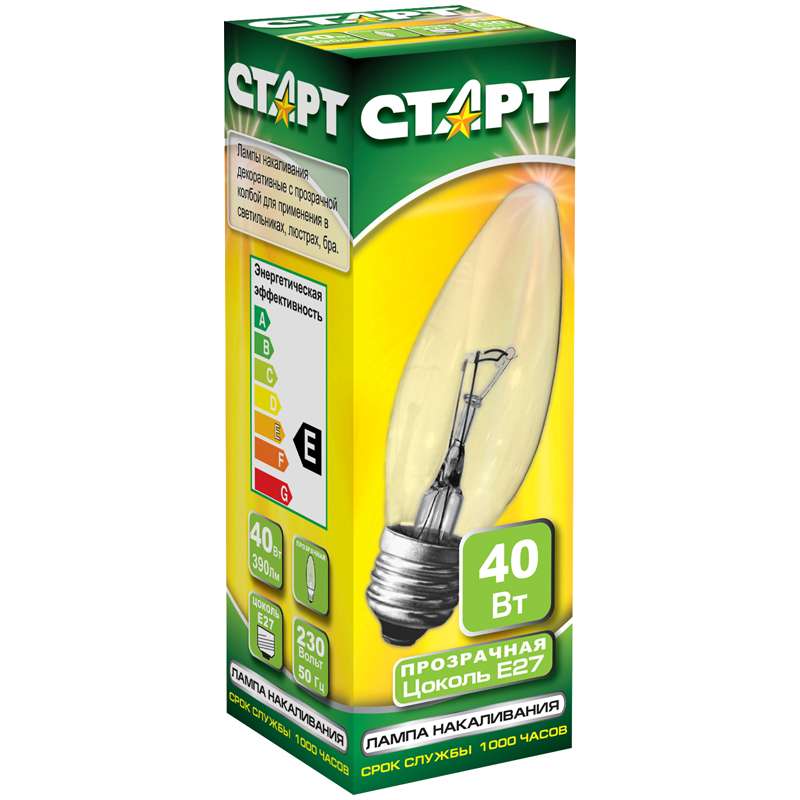 Лампа накаливания свеча – наиболее распространенный источник света для применения в светильниках, люстрах и браЛампа накаливания СТАРТ ДС 40W Е27 прозрачная свеча