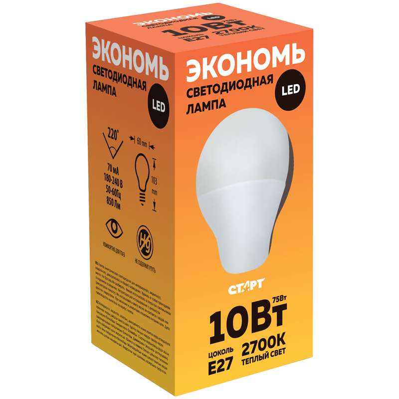 Светодиодные лампы существенно экономичнее люминесцентных, живут значительно дольше, номинальную яркость набирают всегда мгновенно вне зависимости от температуры в помещении.Лампа светодиодная Старт ECO LED GLS E27, 10W30