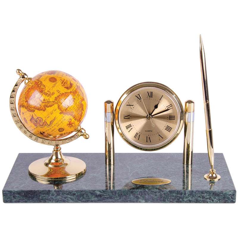 Подставка под ручку в комплекте с шариковой ручкой(цвет чернил - синий), глобусом диаметром 9см и часами. Батарейка в комплектеПодставка под ручку Delucci с глобусом и часами, зеленый мрамор