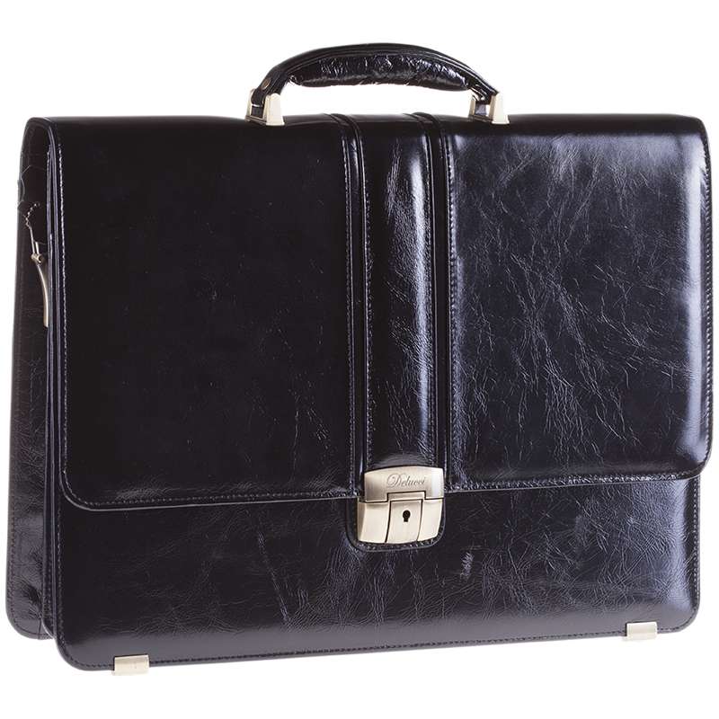 Портфель кожаный. На внешней передней стенке карман. Два отделения с перегородкой на молнии. Наборный пенал на внутренней задней стенке. Карман на внешней задней стенке. Плечевой ремень .Портфель Delucci "Стефано" кожа, черный, 2 отделения, метал. замок, с ремнем