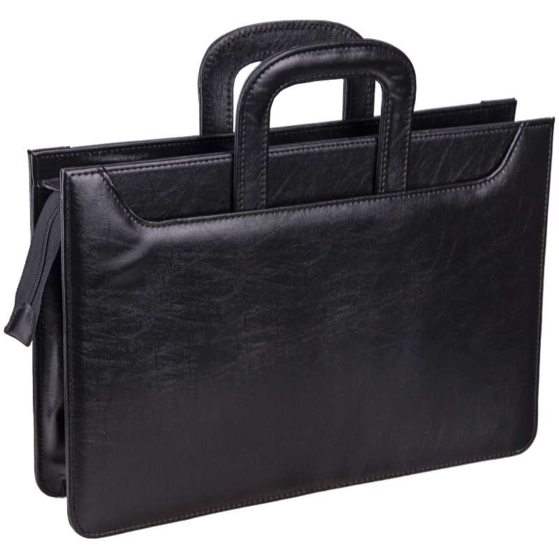 Деловая папка-портфель из искусственной кожи. Портфель имеет выдвигающиеся ручки, два внутренних отделения для хранения бумаг формата А4, а также внешние карманы спереди и сзади. Папка-портфель застегивается на молнию. Размер 380х260х100мм.Портфель OfficeSpace "Irena" кожзам, черный, 2 отделения, молния, задвиг. ручки
