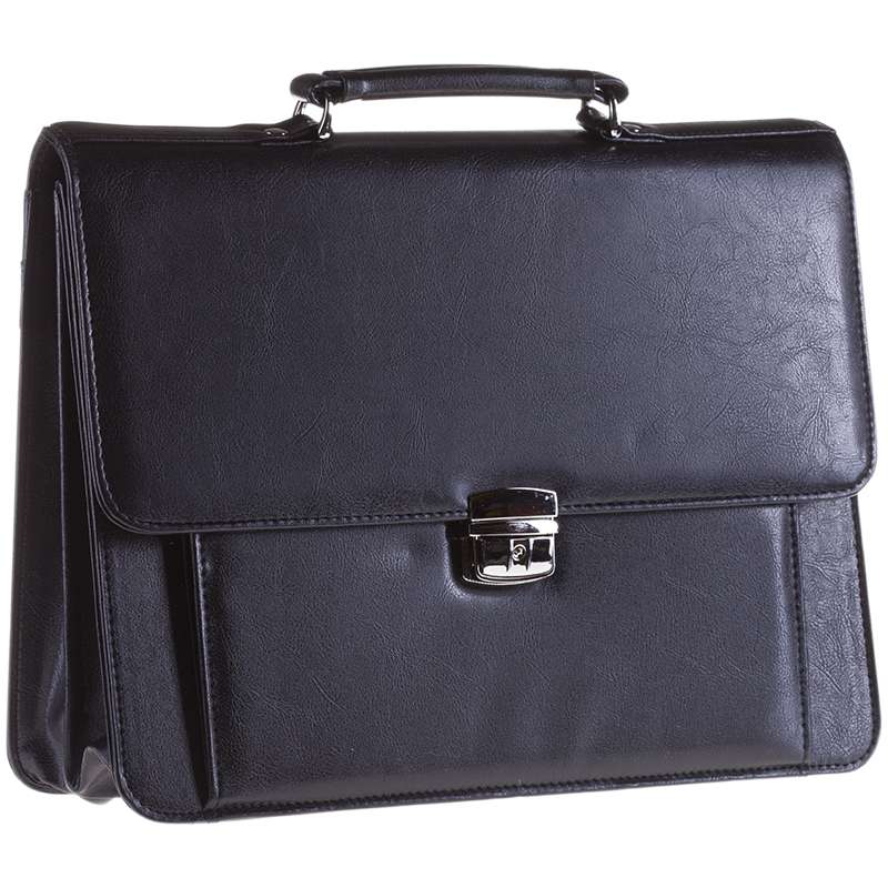 Бизнес-портфель из искусственной кожи. Кожаная ручка. Портфель закрывается на клапан с замком-защелкой. Внешний карман спереди. Внутри два объемных отделения для хранения документов формата А4. Размер 370х280х140мм.Портфель OfficeSpace "Irida" кожзам, черный, 2 отделения, метал. замок