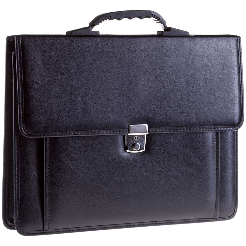 Портфель закрывается на клапан с замком-защелкой. Внешний карман спереди. Внутри отделения для хранения документов формата А4. Размер 380х290х85мм.Портфель OfficeSpace "Rotterdam" люкс кожзам, черный, 3 отделения, метал. замок, с ремнем