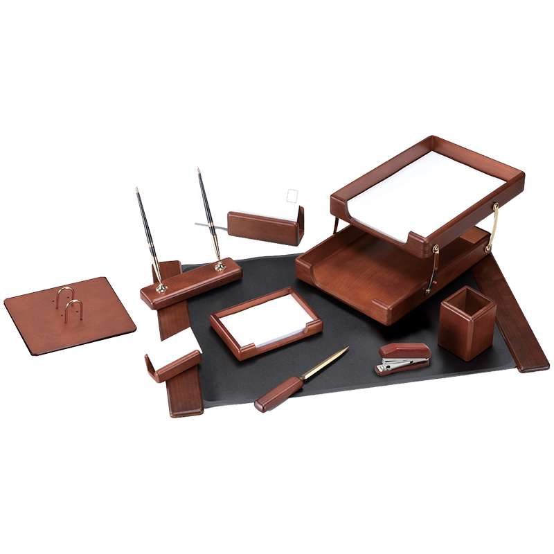 Классический стиль помогает аксессуарам с легкостью вписываться в любой интерьер, дополняя и обогащая его. Набор из натурального дерева придаст завершённый вид рабочему месту любого руководителя или сотрудника. В него входят: подкладка для письма, подставка для ручек, подставка для бумажного блока, подставка для визитных карточек, подставка для конвертов, подставка для карандашей, подставка под календарь, нож для открывания писем, степлер, двухуровневый лоток для бумаг.Набор настольный Delucci 10 предметов, темно-коричневый орех