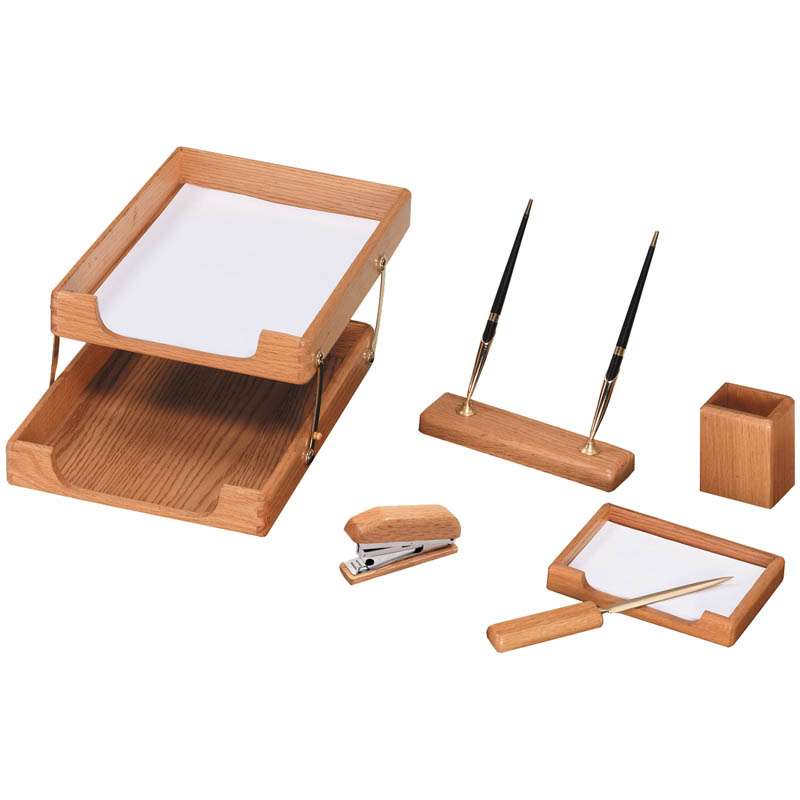 Красивый подарочный набор выполнен в сдержанной тепловой цветовой гамме и включает в себя самые необходимые в любом офисе предметы: подставка для бумажного блока, подставка для ручек, степлер подставка для карандашей, нож для открывания писем, двухуровневый лоток для бумаг. Материал- натуральное дерево.Набор настольный Delucci 6 предметов, светлый дуб