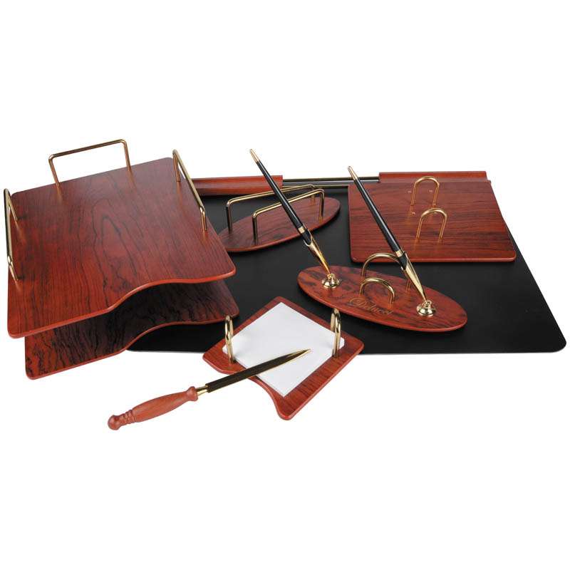 Данный настольный набор призван подчеркнуть яркую индивидуальность и современные взгляды владельца. В набор входят: подкладка для письма, подставка для ручек, подставка для бумажного блока, подставка для конвертов, нож для открывания писем, подставка для календаря, двухуровневый лоток для бумаг. Материал- натуральное дерево.Набор настольный Delucci 7 предметов, розовое дерево