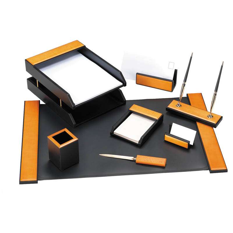 Очень оригинальный, невероятно эффективный набор светло-черного оттенка. В настольный набор входят: подкладка для письма, подставка для ручек, подставка для бумажного блока, подставка для визитных карточек, подставка для конвертов, подставка для карандашей, нож для открывания писем, двухуровневый лоток для бумаг. Материал- натуральное дерево.Набор настольный Delucci 8 предметов, светло-черный
