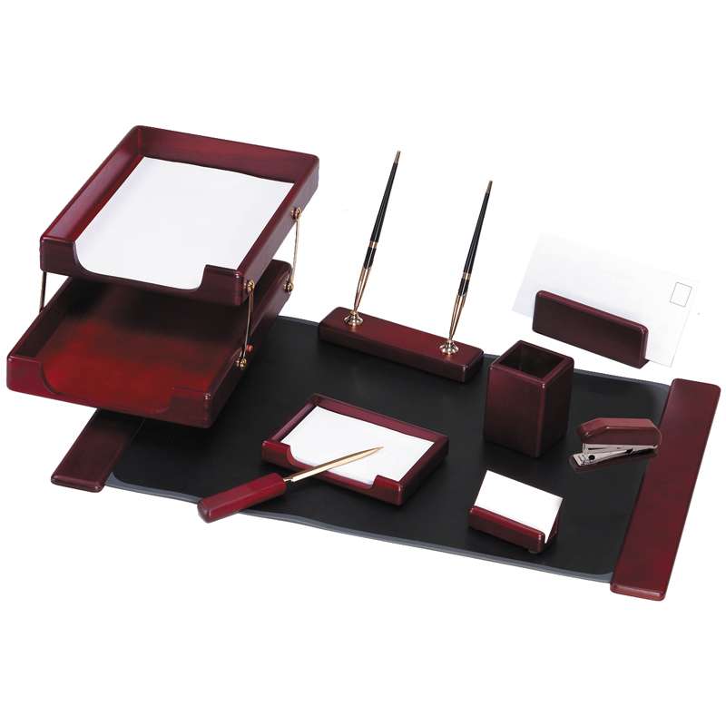 Набор из натурального дерева является идеальным подарком руководителю, украсит любой кабинет или офис. В состав входят: подкладка для письма, подставка для ручек, подставка для бумажного блока, подставка для визитных карточек, подставка для конвертов, подставка для карандашей, нож для открывания писем, степлер, двухуровневый лоток для бумаг.Набор настольный Delucci 9 предметов, красное дерево