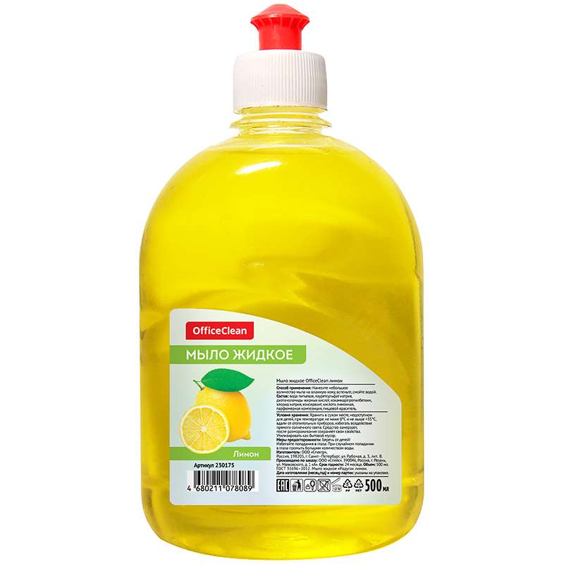 Главная / Товары / КАНЦТОВАРЫ / УПАКОВКА / ХОЗ ТОВАРЫ / РАСХОДНЫЕ МАТЕРИАЛЫ / Хозяйственные товары / Бытовая химия / Мыло / Мыло жидкое OfficeClean "Лимон", пуш-пул, 0,5л