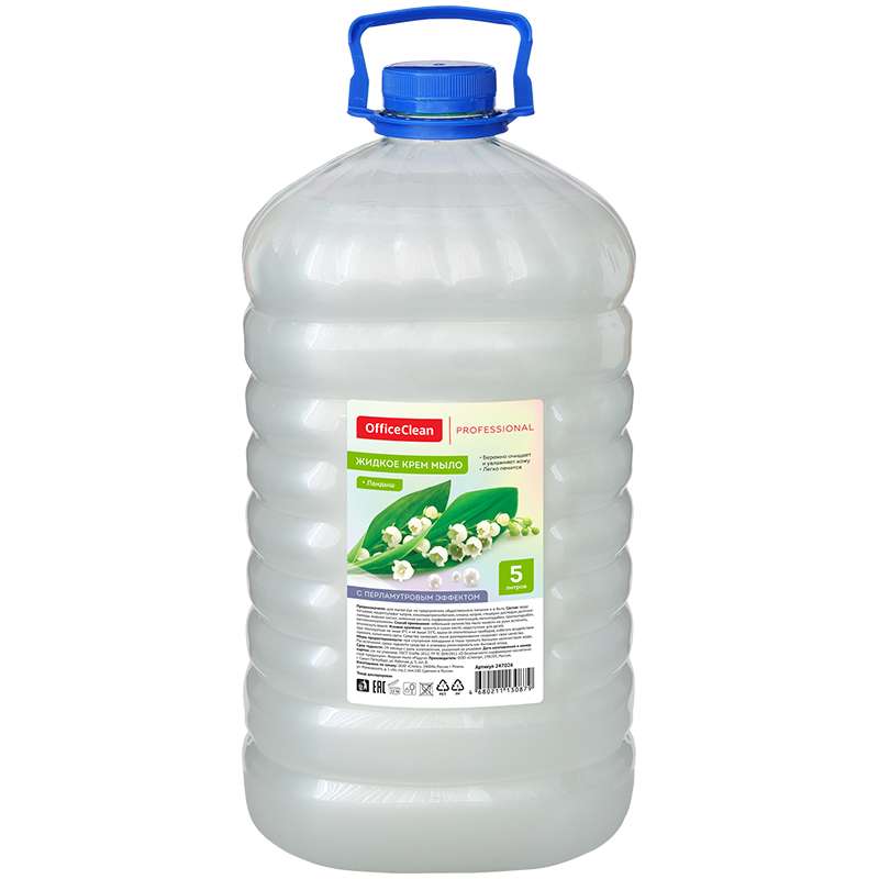 Главная / Товары / КАНЦТОВАРЫ / УПАКОВКА / ХОЗ ТОВАРЫ / РАСХОДНЫЕ МАТЕРИАЛЫ / Хозяйственные товары / Бытовая химия / Мыло / Мыло-крем жидкое OfficeClean "Professional. Ландыш" перламутровое, ПЭТ, 5л