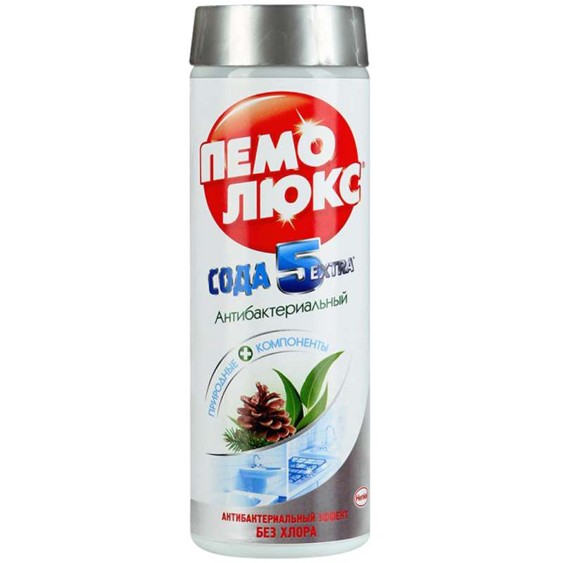 Уникальная формула Пемолюкс Эвкалипт и Пихта с содой и мягким абразивом дополнена натуральными эфирными маслами эвкалипта и пихты, которые известны своими антибактериальными свойствами. Уничтожает бактерии, не содержит хлора и опасных химикатов. Подходит для чистки раковин (на кухне и в ванной комнате), плит, кафеля, ванн, унитазов и различных твердых поверхностей по всему дому. Химический состав: <5% амфотерные ПАВ, кислородсодержащий отбеливатель, отдушка; природный молотый мрамор, сода, сульфат натрия, краситель.Средство чистящее Пемолюкс порошок, "Сода 5Extra. Антибактериальный", 480г
