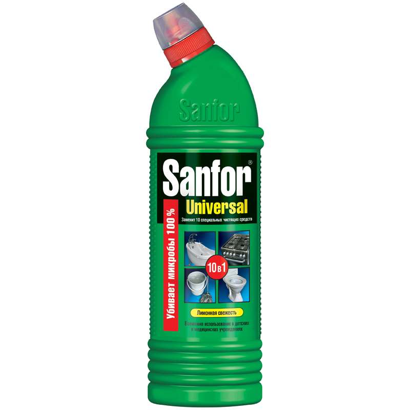 Легко и быстро отчистит раковины, ванны и душевые кабины, унитазы, сливы и водостоки, керамическую плитку, кухонные плиты, любые твердые моющиеся напольные покрытия, настенные панели, моющиеся обои, бытовую технику. Подходит для уборки и дезинфекции туалетов для животных. Не повреждает поверхности! Эффективно устраняет серый налет, плесень, жир, мыльные потеки, въевшиеся пятна от продуктов питания и другие загрязнения. Благодаря загущенной формуле экономичен в расходе. Обеспечивает свежий запах. Химический состав:6 % или более, но менее 15 % - гипохлорит натрия (калия), менее 5 %: АПАВ и НПАВ, менее 5 %: щелочь, ароматизаторСредство чистящее Sanfor "Лимонная свежесть", 1л