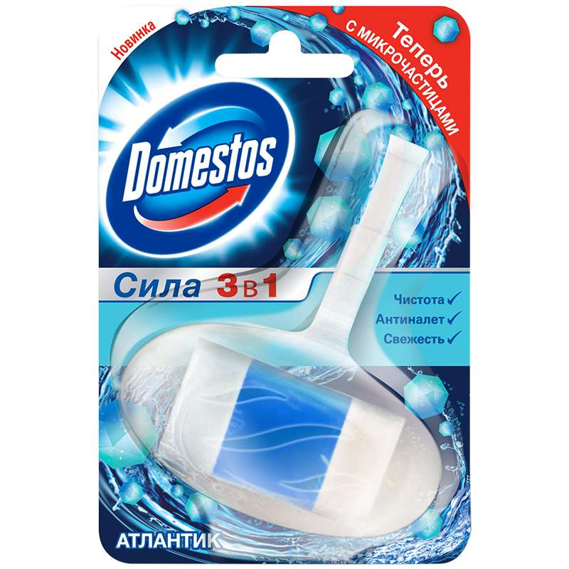 Domestos Атлантик 3в1 - это уникальный туалетный блок, он состоит из трех компонентов и поэтому обладает тройным действием: устраняет источник бактерий, предотвращает появление известкового налета, обеспечивает свежий аромат благодаря парфюмированной гелевой полосе. Domestos Атлантик 3в1 обеспечивает гигиеничность при каждом смыве.Подвесной блок для унитаза Domestos "3 в 1 Атлантик" 40г, твердый
