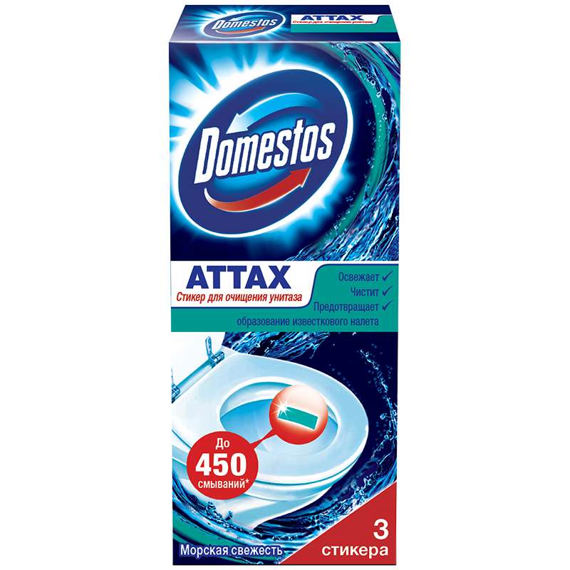 Стикеры Domestos "Морская свежесть" помогут вам поддерживать чистоту, свежесть и гигиену. Легко наносятся (наносить нужно на сухую поверхность), после использования не оставляют следов и разводов. При каждом спуске воды специальные ароматизаторы создают запахи морской свежести. Один стикер Domestos "Морская свежесть" рассчитан на 450 спусков воды. В наборе - 3 стикера.Стикер для очищения унитаза Domestos "Морская свежесть", 3*10г