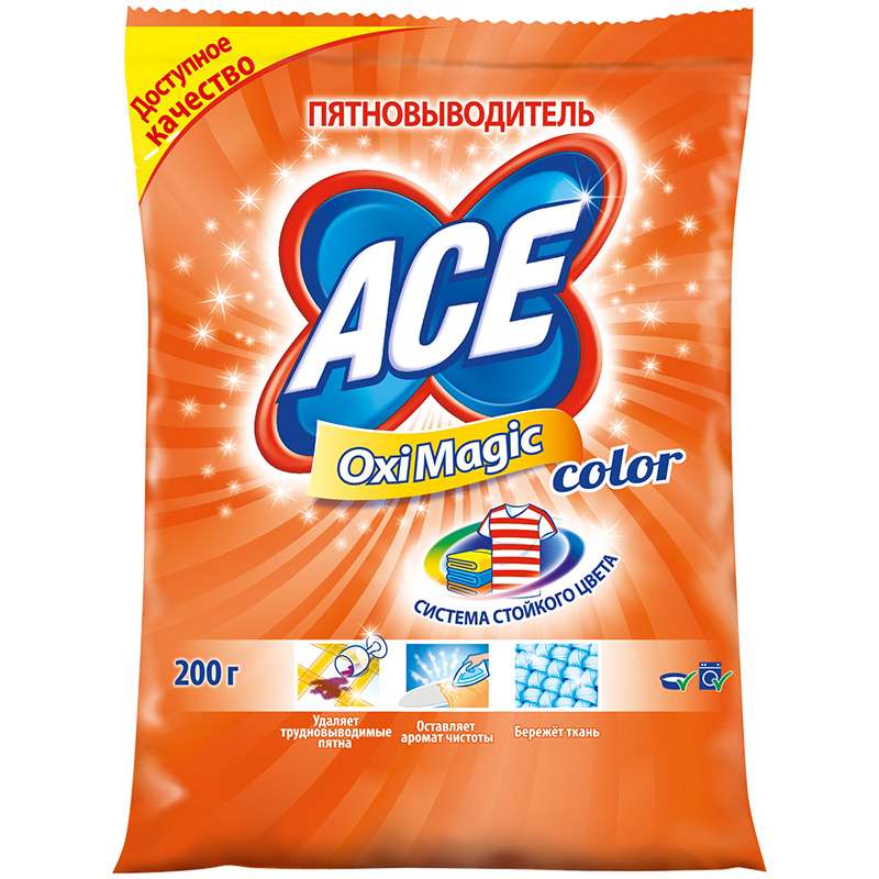 Главная / Товары / КАНЦТОВАРЫ / УПАКОВКА / ХОЗ ТОВАРЫ / РАСХОДНЫЕ МАТЕРИАЛЫ / Хозяйственные товары / Бытовая химия / Стиральные порошки / Пятновыводитель Ace "OxiMagic Color", порошок, 200г