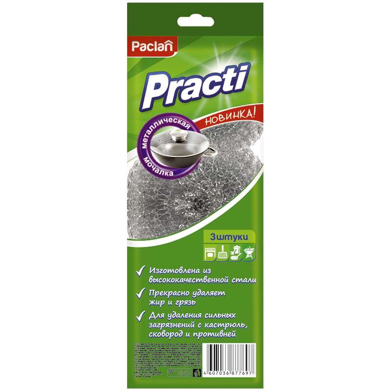 "Предназначены для устойчивых к агрессивной чистке поверхностей, прекрасно справятся с пригоревшей пищей, засохшими остатками и ржавчиной. Благодаря особой структуре металлических стружек и специальному плетению мочалки Paclan чрезвычайно прочные. Отлично справляются с самыми сильными загрязнениями. Удаляют засохшие и пригоревшие остатки пищи, застарелые масляные пятна. Идеально подходят для чистки кастрюль, чугунных сковородок и противней. Размер и круглая форма мочалки разработаны для легко и удобного применения. Легко промываются водой и не приобретают неприятного запаха. "133303 Мочалки для посуды металлические PACLAN "PRACTI", 3 шт/упак 408135/408130/408210 [РЦ]
