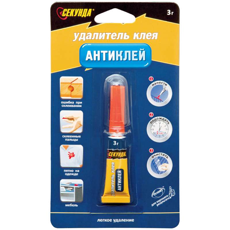 Для надёжного решения задач, связанных с удалением клеевого состава, используйте АНТИКЛЕЙ «СЕКУНДА». Он позволяет разрушать даже застарелый клеевой слой практически любых видов, в том числе цианоакрилат (любых торговых марок). Он бережно относится к любым материалам, пригоден для контакта с лакокрасочными материалами, не раздражает кожу рук.Антиклей "Секунда", 3г., лента