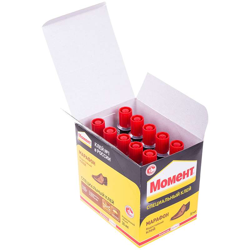 Клей предназначен для склеивания обуви и обувных материалов в различных сочетаниях: кожи, кожзаменителя, резины, ткани, войлока, пробки, термоэластопласта, пластика, а также дерева, металла, поливинилхлорида и других материалов.Клей "Момент-Марафон" обувной 30мл., шоу-бокс