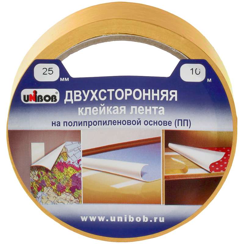 Используется для склеивания гладких поверхностей и материалов при проведении монтажных, ремонтных, дизайнерских и оформительских работ. Основные преимущества продукта: Удобная замена механическим крепежам, подходит для монтажа легких предметов интерьера. Может применяться как и для горизонтальных, так и для вертикальных поверхностей. Небольшая толщина пленки делает место склейки практически не заметной. Клеевой слой на основе синтетического каучука обеспечит надежное крепление на вертикальные и горизонтальные поверхности. Цветная информативная этикетка. Каждый рулон упакован в термоусадочную пленку, что позволяет сохранить все свойства и технические характеристики продукта. С ее помощью можно сделать укладку коврового покрытия на деликатные поверхности (дерево, керамика, мрамор); склеивание бумаги, картона; крепление этикетокКлейкая лента двусторонняя Unibob, 25мм*10м, полипропилен, инд. упаковка