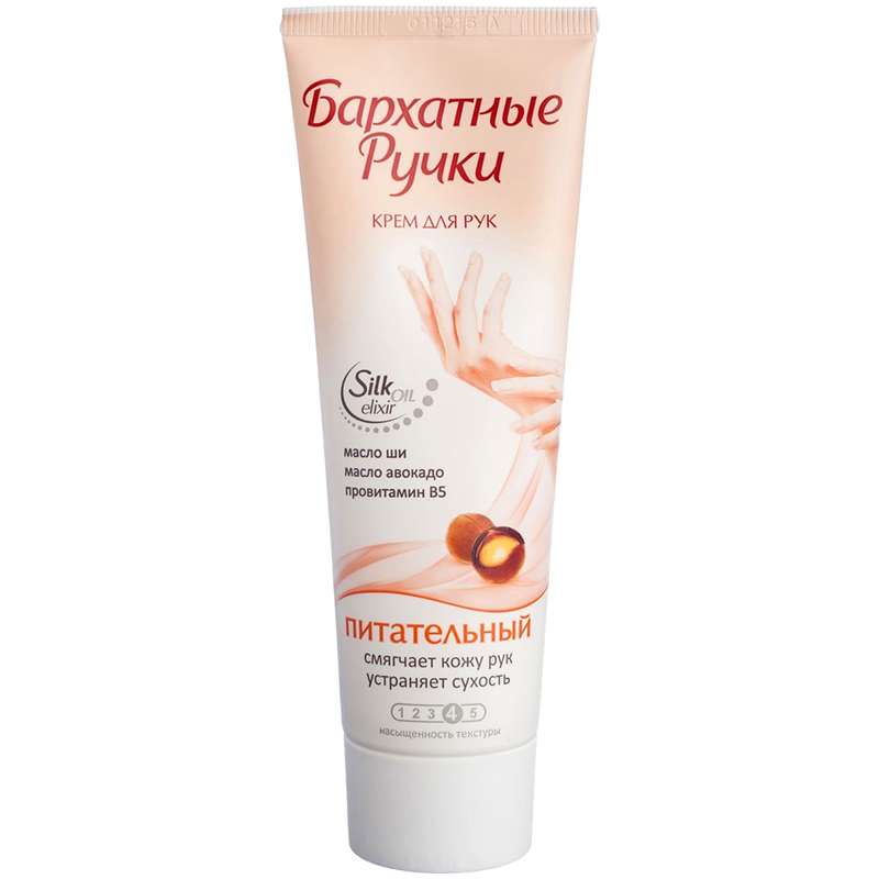 Специальная формула крема разработана для смягчения кожи рук и интенсивного питания. Комплекс эффективно действующих компонентов оказывает увлажняющее и успокаивающее действия, питает кожу, повышая ее эластичность. Действие крема усилено формулой Silk oil elixir. Микро-масла восстанавливают клетки кожи, и в комплексе с протеинами шелка делают ее мягкой и нежной. Красота и нежность Ваших рук в каждом прикосновении!Крем для рук Бархатные ручки, питательный, 80мл