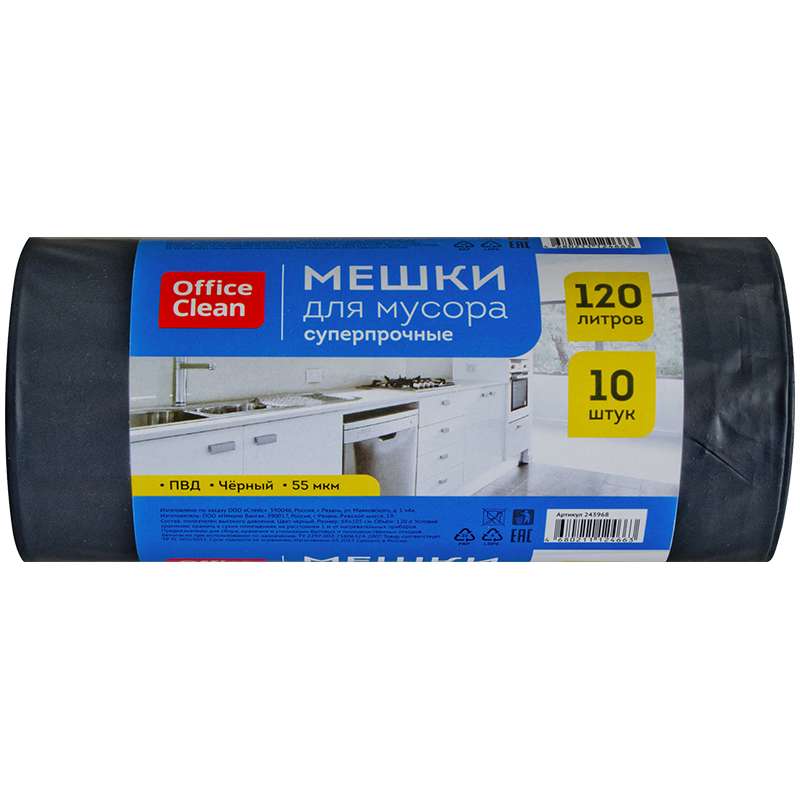 Главная / Товары / КАНЦТОВАРЫ / УПАКОВКА / ХОЗ ТОВАРЫ / РАСХОДНЫЕ МАТЕРИАЛЫ / Хозяйственные товары / Мешки для мусора / Мешки для мусора 120л OfficeClean ПВД, 68*105см, 55мкм, 10шт, суперпрочные, черные, в рулоне