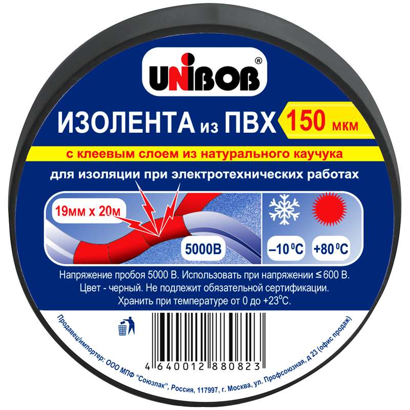 Главная / Товары / КАНЦТОВАРЫ / УПАКОВКА / ХОЗ ТОВАРЫ / РАСХОДНЫЕ МАТЕРИАЛЫ / Хозяйственные товары / Товары для дома / Изоленты / Изолента Unibob 19мм*20м, 150мкм, черная, инд. упаковка