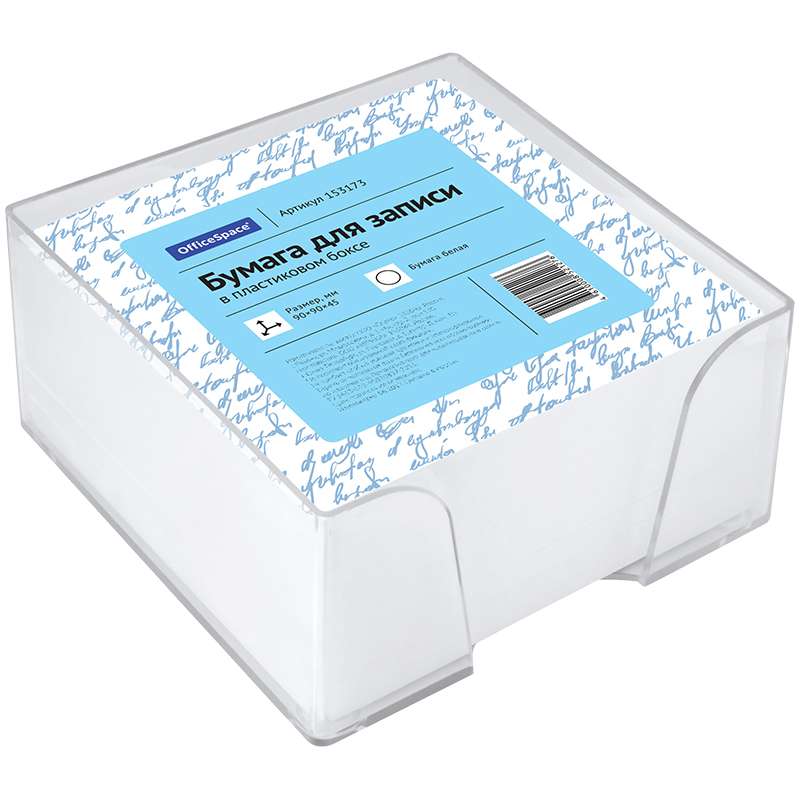 Блок для оперативных записей в удобном пластиковом боксе. Размер листа в блоке - 90 × 90 мм, 500 листов. Плотность бумаги 60 г/м2, белый. Упакован в термоусадочную пленку.153173 Блок для записи OfficeSpace, 9*9*4,5см, пластиковый бокс, белый 153173 [РЦ]