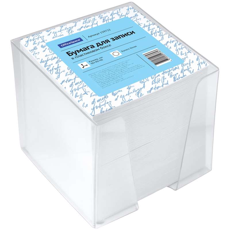 Блок для оперативных записей в прозрачном боксе. Размер листа в блоке - 90 × 90 мм, 1000 листов. Плотность бумаги - 60 г/м2, белый.159722 Блок для записи 9*9*9 см, пластиковый бокс, белый КБ9-10 БСн [РЦ]
