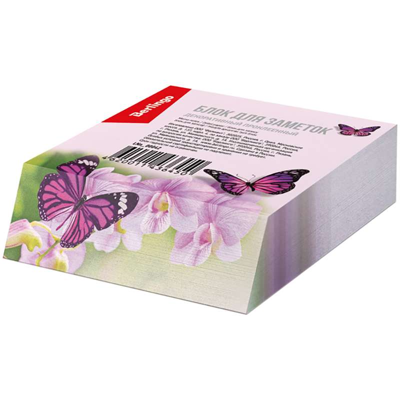 Декоративный блок для записей с косым срезом. В блоке 300 листов. Бумага офсетная 70 г/м2, с оригинальным рисунком. Проклеен по одному краю. Индивидуальная упаковка в термоусадочную плёнку.Блок для записи декоративный на склейке Berlingo "Бабочки", 9*11*3см