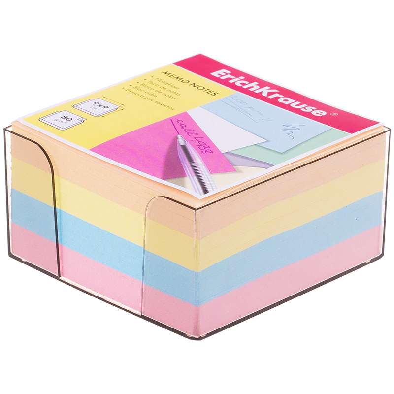 Блок для оперативных записей в пластиковом боксе, 500 листов, цветной. Размер листа в блоке - 90 × 90 мм. Бумага плотностью 80 г/м². Индивидуальная упаковка в термоусадочную пленку.Блок для записи Erich Krause, 9*9*5см, пластиковый бокс, цветной