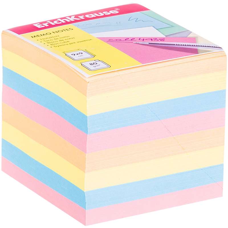Блок для оперативных записей, 900 листов, цветной. Размер листа в блоке - 90 × 90 мм. Бумага плотностью 80 г/м². Индивидуальная упаковка в термоусадочную пленку.Блок для записи Erich Krause, 9*9*9см, цветной