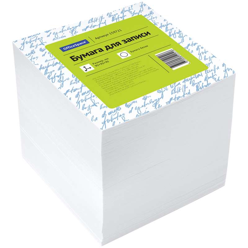 Блок для оперативных записей. Размер листа в блоке - 90 × 90 мм, 1000 листов. Плотность бумаги 60 г/м2, белый.Блок для записи OfficeSpace, 9*9*9см, белый