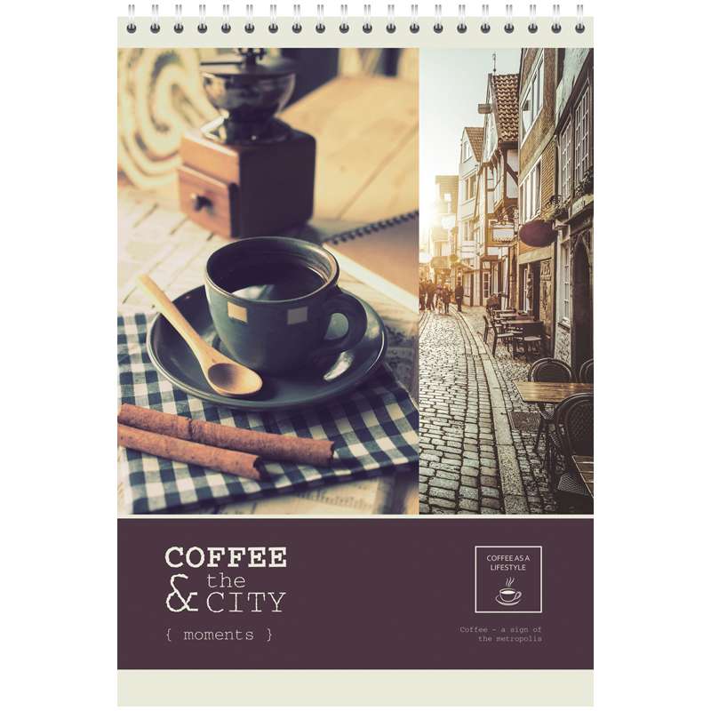 60 листов. Обложка – мелованный картон с глянцевым лаком. Внутренний блок – офсет 60 г/м2, клетка. Формат А4. Крепление – евроспираль.Блокнот А4 60л. на гребне "Кофе"